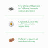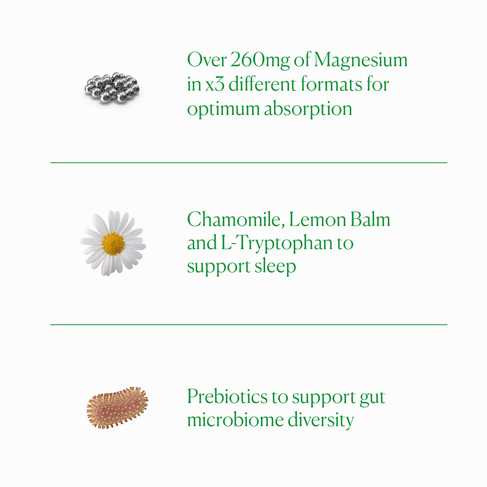 Formulated with three different forms of magnesium: Magnesium Bisglycinate, Magnesium Citrate, Magnesium Taurinate for optimum absorption. Supporting the normal and healthy functioning of the nervous system, in turn aiding a better night's sleep and a healthier gut. Lemon Balm and Chamomile boost relaxation, while L-Tryptophan and L-Ornithine work in tandem to reduce stress, everyday anxiety and support sleep.